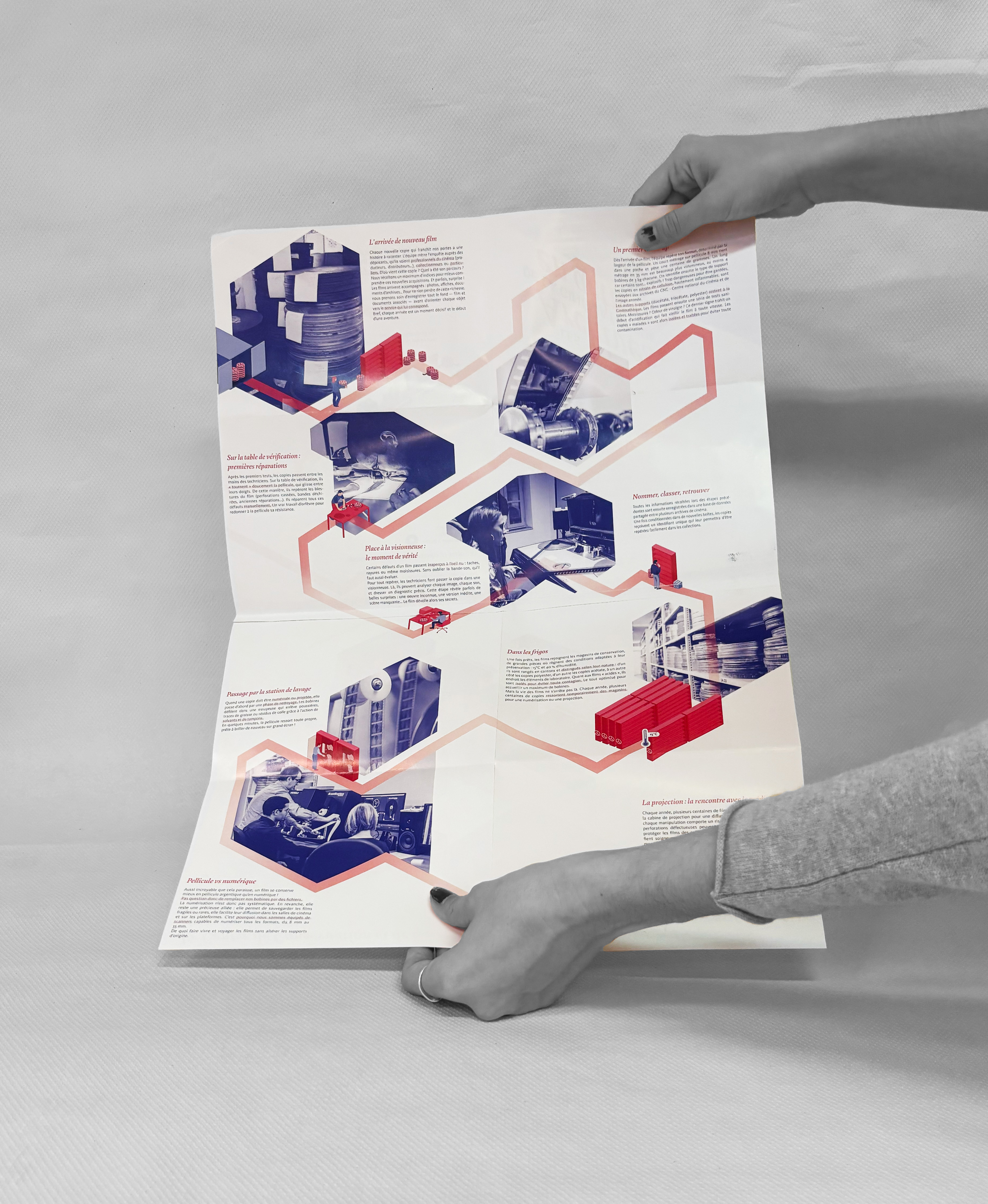 Le tout en 3D isométrique, donnant un aspect visuel très technique au document. Un chemin a été dessiné afin de montrer un parcours au sein de ce lieu. Il guide visuellement le public pour le laisser visiter.