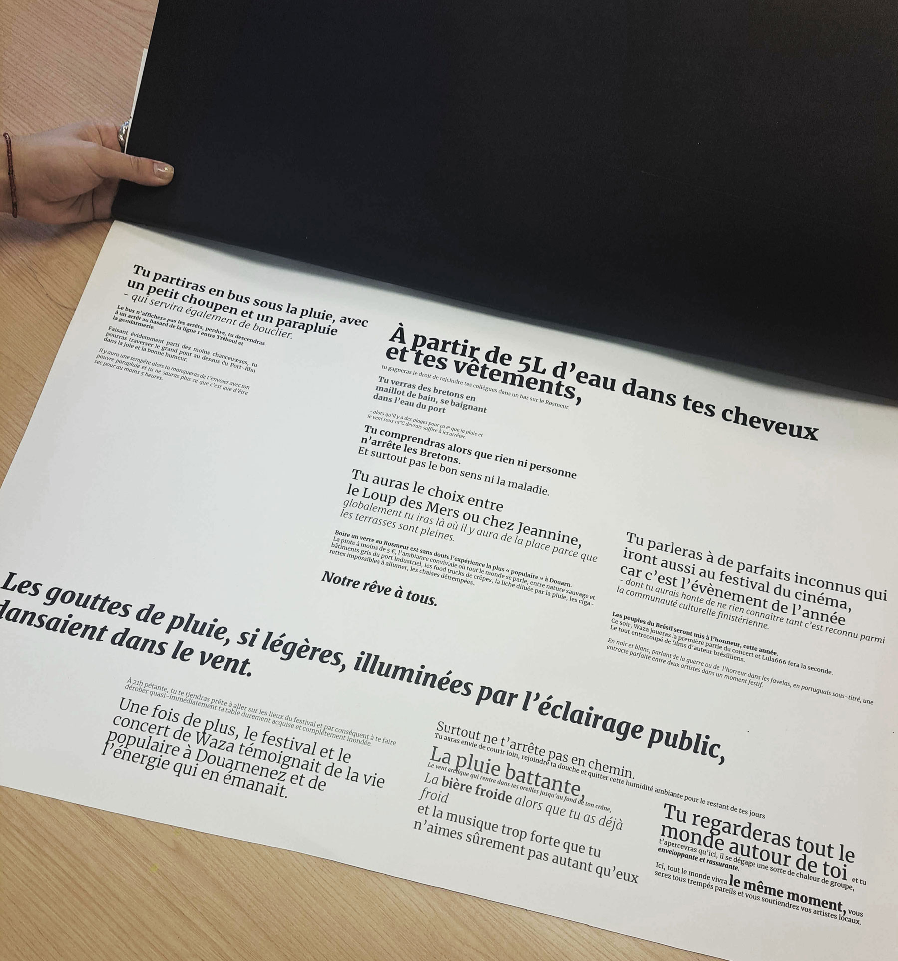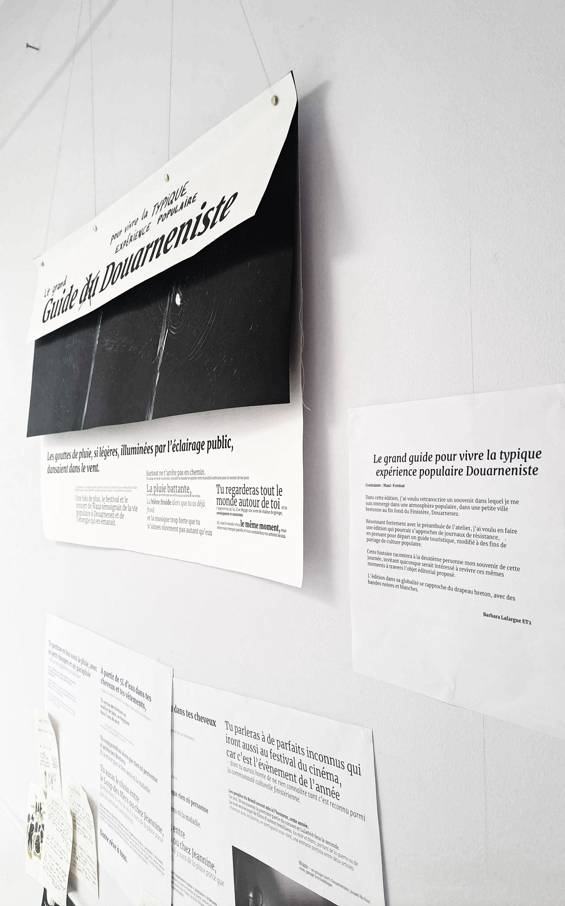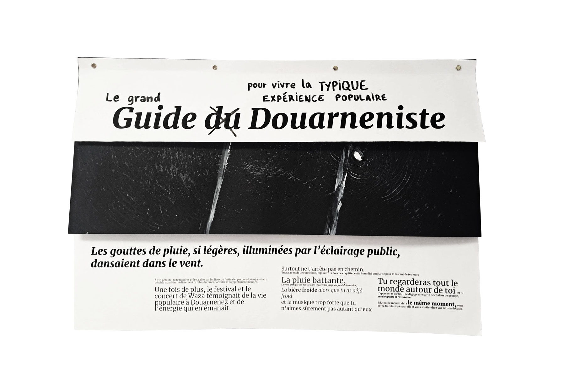 Cette édition retranscrit un souvenir dans lequel je me suis immergée dans une atmosphère populaire, dans une petite ville bretonne au fin fond du Finistère, Douarnenez. Il s’agit d’une édition qui pourrait s’approcher de journaux de résistance, en prenant pour départ un guide touristique, modifié à des fins de partage de culture populaire.